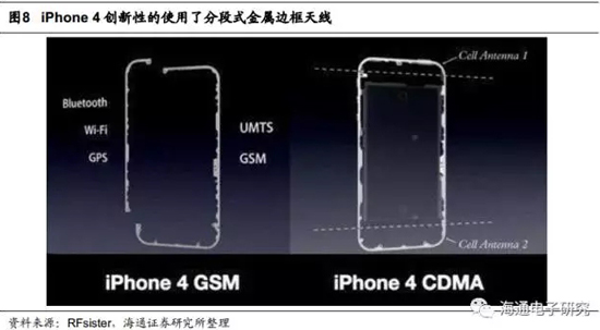 本次天线革命源自iPhone 4,苹果对天线方案做了非常激进的改进,机身不锈钢边框被分成两段,分别成为Wi-Fi/BT/GPS天线和通信主天线。不锈钢边框上焊接了性状复杂的金属片,用于在不同通信模式和频段下进行匹配调谐。