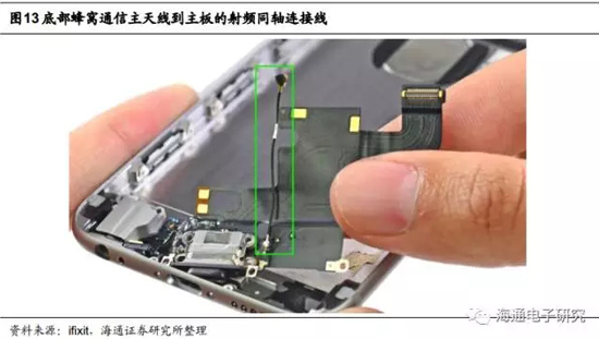 以iPhone 6为例,金属后盖经过纳米注塑工艺进行加工后将不同段的金属进行分离,顶部的A段金属和底部的E段金属作为天线使用。其中A天线包括了Cellular副天线、双频Wi-Fi、蓝牙、GPS、NFC等功能。