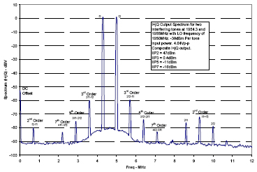 图2描绘了当两组与有用信号频率非常接近的CW(连续波)干扰音出现时接收机的I+jQ输出频谱。在这种测试情况下,输入信号电平在-30dBm左右。这是一种非常恶劣的强干扰情景,比3G和4G蜂窝系统中要求的任何标准特定强干扰测试条件都要严重得多。在采样接近或处于基带频率的信号时,来自二阶、三阶、四阶甚至五阶和七阶非线性的谐波失真可能会限制大信号输入条件下的性能。特别要指出的是,I/Q解调器的非线性行为必须足够适当,以确保从有用和无用信号产生的互调项不会破坏感兴趣的有用信号。