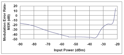 一般来说,一个接收机在接收到的输入信号功率范围内有三处独特的MER限制。在大信号电平段,由于接收机中的非线性而落入频带内的失真分量将导致MER急剧下降。在中等信号电平段,接收机工作于线性方式,信号远高于任何噪声电平,此时MER达到最佳值,并受解调器正交精度、滤波器网络与可变增益放大器(VGA)以及测试设备精度的支配。随着信号电平的走低,噪声的影响越来越显著,相对于信号电平的MER性能将随信号电平的下降呈dB-for-dB下降。在更低信号电平,噪声将成为主要限制因素,以分贝为单位的MER将直接与SNR呈正比关系。