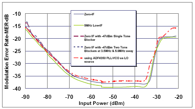 图4:在零中频、低中频和强干扰情况下WCDMA信号的MER与RF输入功率关系曲线。