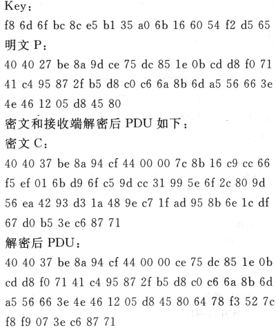 第44个到51个字节为解密后的8个字节的分组链接模式校验码。在CCM解密程序中,对解密后得到的PDU,计算分组链接模式校验码,将计算结果和解密所得的分组链接模式校验码相比较,若相同则表示密文在传输过程中没有被篡改破坏,这样可以校验传输数据的完整性。