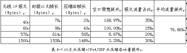 随着网络不断发展,IPv6格式报文会逐渐占据网络主导,对于IPv6封装的报文,帧头压缩技术能够提供更高的平均流量提升比,预计比例如表4-2所示: