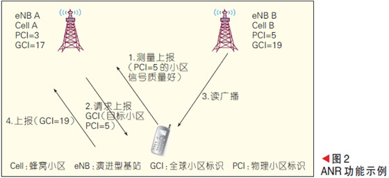(2)ANR 方案为了进行切换和干扰协调,需要为下辖小区建立和维护邻区关系表。自动邻区关系功能用于辅助发现未配置的邻小区,触发邻区关系表中相应表项的建立和维护操作。自动邻区关系机制不仅适用于发现同频邻区,还可用于发现异频和异系统邻区。邻区发现的过程如图所示。