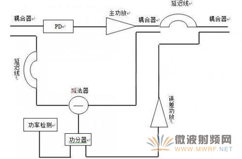 如图2所示,输入信号首先通过定向耦合器一路经过延时线准备和输出信号进行抵消,从而检测对消的情况,另一路送入预失真单元(PD)中产生失真信号,从而改善主功放的线性程度。同时主功放的输出耦合一部分同经过延时的主信号进行对消,去除主信号,仅仅保留误差信号,通过功分器,一方面作为对消效果的检测从而作为闭环控制的参考,;另一方面送入误差功放放大在与主功放耦合对消互调信号,从而进一步改善互调。这里如果改善效果仍旧不理想,达不到超线性的要求即70dBc的话,可以将前馈环在增加一级,够成3或4级环,从而提高改善效果。