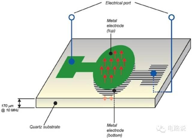 BAW filter的最基本结构是两个金属电极夹着压电薄膜(Quartz substrate在2GHz下厚度为2um),声波在压电薄膜里震荡形成驻波(standing wave)。