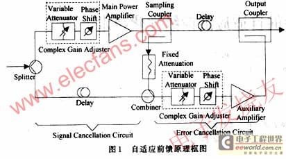 图1所示是基本的前馈环框图。未失真的抽样信号经延迟后与主放大器放大的信号经过适当的衰减耦合后在0°~180°合成器中比较。如果主放大器无增益和相位失真,合成器产生零输出。若主放大器有任何增益和相位失真、压缩或AM-PM效应,合成器输出端就会有小的RF误差信号,输入到误差放大器放大到输出抽样信号的电平,主信号经延迟并补偿误差放大器的延迟后与误差放大器的输出合成校准后输出。必须强调,相位与振幅的校准——加或减,全都在RF下进行,而不是在视频或基带进行。即校准在最终带宽内进行。最终带宽由系统各种元件的相位、振幅的跟踪特性决定。