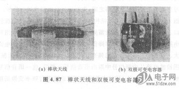 图4.87所示的是在中波段的AM广播接收机使用的天线线圈和可变电容。图4.87(a)称为棒状天线,铁氧体磁芯上缠绕着天线线圈,体积小但具有很高的感应电动势。棒状天线在与磁芯垂直的方向上具有8字形方向特性。图4. 87(b)是可变电容器,在数pF~150pF左右变化,覆盖525~1605kHz的中波段广播。