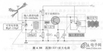 图4.88是一高频放大电路的例子。由于高频放大电路使得灵敏度提高,仅对所需频率的信号进行放大,故信噪比(SN比)上升,此外还可以防止镜像干扰(参照第4.9节)。