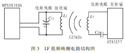 文中设计的检测端采用Freeseale公司的MPXY8300A传感器,其自身已集成LF低频唤醒电路。LF低频唤醒发射端采用ATA5275芯片。低频唤醒电路结构如图3所示。此举可通过减少工作时间来降低系统能耗,从而延长轮胎爆胎预警系统的工作时间。