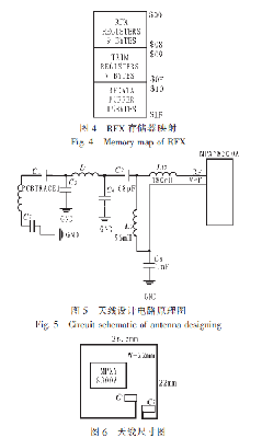 文中的TPMS轮胎检测端射频发射电路集成到MPXY8300A芯片中,极大的减少了射频电路的结构。MPXY8300A通过内部一个包含32个8位寄存器的RFX模块来设置各项射频发射参数,其存储器映射结构如图4所示。MCU将存储在$10-$1F中的128位数据通过天线发射出去(315/433 MHz)。其电路原理图及天线尺寸如图5和图6所示。