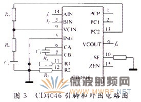 压控振荡器需要外接电阻R1,R2和电容C1。R1,C1是充放电元件,电阻R2起到频率补偿作用。VCO的振荡频率不仅和R1,R2以及C1的取值有关,还和电源电压有关,电源电压越高振荡频率越高。