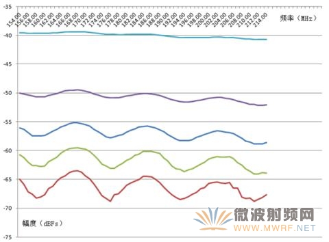 ADS58H40 的采样时钟为 245.76MHz,针对其第二奈奎斯特域的中心 60M 范围,使用 5 个功率等级进行扫频。在功率大于-40dBFs 时,由于 PCB 布局不当所引入的码域翻转干扰对输入信号影响很小(由于 ADC 前端有滤波器的关系,所以输入信号不是完全平整的)。但是随着输入信号功率的减小此干扰对输入信号的影响越来越大,在输入信号幅度低于-60dBFs 时,去除模拟输入端滤波器的影响后其引起的功率误差依然可以达到 3dB 以上。