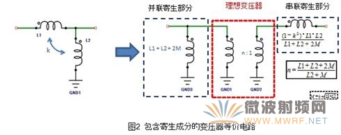 如果在这样的天线中安装一定变压比的变压器,是不能只整合一个band的阻抗的。所以,天线用变压器,必备的设计需求是要使变压比适应天线的阻抗频率特性。这种适应方法如图2所示,是一种将理想的变压部分和寄生成分部分分解开来的等效电路。
