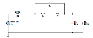 图2为3元件LRC电感模型的仿真测试电路。L、R和CP用于对电感进行建模。V1是理想的交流测试电压源,电阻RS表示V1的源电阻。CL和RL是负载元件,其中CL设置为ADALM2000示波器输入通道的典型输入电容。RL可以设置为RS,也可以设置为更高的值,例如示波器通道的1 MΩ输入电阻。