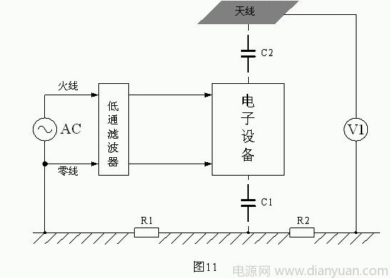 辐射干扰一般是通过电磁感应的形式在空间进行传播的,图11是测试电子设备产生辐射干扰的基本方法,或表示电子设备产生的干扰信号通过电磁感应向空中辐射的原理。图11中,电子设备表示干扰信号源,V1表示测量仪表,C1表示电子设备对大地的电容,C2表示电子设备与天线偶合的电容,即:电子设备通过电场对天线产生感应,这里的天线也可以看成是被干扰的设备。图11的测试方法就是测试电子设备周围规定距离某处的电磁场强度,由于干扰信号一般都是一个频率成份非常丰富的非正弦波,因此,无法对它进行直接测量,只能对它其中某一个频率信号单独进行测量。