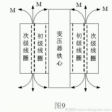 图9是开关电源变压器产生的漏磁通的原理图。开关电源变压器的漏磁通大约在5%~20%之间,反激式开关电源变压器为了防止磁饱和,在磁回路中一般都留有气隙,因此漏磁通比较大,即:漏感比较大。因此,产生漏感干扰也特别严重,在实际应用中,一定要用铜箔片在变压器外围进行磁屏蔽。从原理上来说,铜箔片不是导磁材料,对漏磁通是起不到直接屏蔽作用的,但铜箔片是良导体,交变漏磁通穿过铜箔片的时候会产生涡流,涡流产生的磁场方向正好与漏磁通的方向相反,是部分漏磁通被抵消,因此,铜箔片也可以起到磁屏蔽的作用。