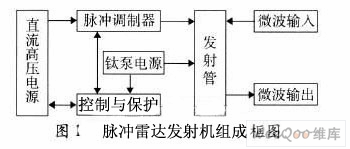 脉冲雷达发射机不管采用栅极调制方式还是阴极调制方式都工作在高压大电流的脉冲状态,一般由发射管、脉冲调制器、直流高压电源和控制保护等单元模块组成(组成框图见图1)