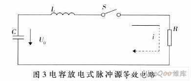 回路的等效电路如图3所示,为一个标准的RLC串联放电回路。当开关S在!=0时刻接通,电路的方程为