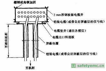 (3)电缆竖井处的电缆进出由于电缆竖井是作为同一个屏蔽区域,从电缆竖井至各层机房(非屏蔽区)的管线处理也非常重要。做法如图2所示