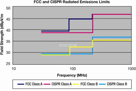 在实验室中,可以在时域和频域中对EMI信号进行预分析。使用一台示波器对信号进行时域观察,然后再使用一台频谱分析仪对信号进行频域评估。但是,通过联邦通信委员会(FCC) 和欧洲国际特别委员会(CISPR) 无线电干扰认证的一些公司,必须在产品上市以前就进行所有辐射EMI 测量。这种要求可以确保测试结果完全符合FCC 和/或CISPR 规定。测试方法包括使用环境测试,并使用经过校准的EMI 测试设备和天线。FCC 和CISPR 要求设备发射的辐射信号必须在规定值以下。FCC 和CISPR 相关文件包括EN 55011、EN 55013、EN 55014、EN 55015、EN 55022和EN 50081-1.2(通用辐射标准)。
