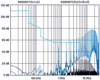 图1. 差分和共模噪声的LTspice图,附有传导辐射限值线