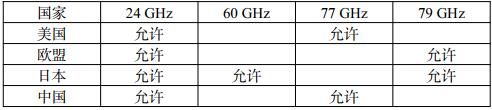 2005~2013年,欧盟将24GHz、79GHz作为车载毫米波雷达的频谱,而美国使用24GHz、77GHz频带,日本选用了60~61GHz的频段。随着世界范围内76~77GHz毫米波雷达的广泛应用,日本也逐渐转入了79GHz毫米波雷达的开发中。各大国的车载雷达频段主要集中在在23~24GHz、60~61GHz和76~77GHz(79GHz)3个频段,而世界各国对毫米波车载雷达频段使用的混乱情况使得汽车行业车载雷达的发展受到了限制,如表2所示。
