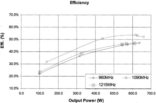 TAN500的典型输入/输出特性曲线和集电极效率曲线如图1和图2所示。从图中可见,在90MHz、1090MHz和1215MHz频率下,输入功率/输出功率有不错的线性关系,而且在额定峰值输出功率500W下,集电极效率超过40%。对于Si双极晶体管射频末极功率放大器来说,TAN500的整体指标处在领先水平。目前TAN系列已有TAN300、TAN350和TA500等多种型号,分别是输出功率300W、350W和500W的同族产品,而且1000W以上的型号将很快推出。实际上,Microsem公司在2005年生产的MDS系列Si双极射频功率晶体管中,MDS1100是用于航空电子设备末级功放的器件。它在+50V电源和1030MHz下可提供超过1000W的峰值功率输出,在20℃环境温度下最大功耗是8750W,最高工作温度可达+200℃,最低集电极效率是45%。TAN系列晶体管的设计理念与MDS系列的完全相同,但是对设计参数进一步优化,达到特性参数最佳的目的。