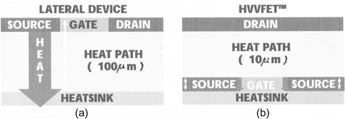 例如利用纵向扩散布局来实现射频功率的MOS场效应晶体管是HVVi半导体公司,它的HVVFET高压垂直场效晶体管系列产品在2008年四月推出,目标是针对要求具有高的峰值/平均功率比的TACAN导航雷达、TCAS交通防撞系统、IFF敌我识别机、Mode-S询问机,以及3G无线移动通信发射机,如WCDMA、TD-SCDMA和光纤OFDM系统等的紧迫应用。