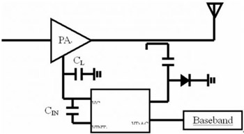使用上,透过基带送一个VDAC值来设定PA所需传送出去的功率值,再利用传感肖特基二极管,测量PA的输出功率,其测量值与VDAC的值相比较,以得到一个误差电流,再经由积分器Cin积分,以决定VC的输出电压,然后,应用VC的电压值来调整PA的放大功率,如此形成一个稳定的控制回路系统,才能确保PA输出功率为基带所设定的功率值。