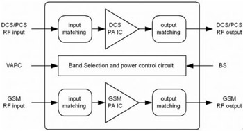 CMOS功率控制IC:此IC可说是PA模块的核心,其功能含:提供HBT IC直流偏压(DC-Bias)、频带选择(Band-Selection between GSM and DCS Band)、温度补偿、自我功率测量(确保PA所输出功率为基站需求值),输出功率调整(不同之输出功率等级调整)、功率开关(在传送与接收之间做切换)及保护装置电路(避免手机使用不当,而发生损坏之现象)。