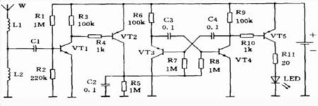 900MHz射频指示器的电原理图如附图所示,射频信号被作为天线(W) 的弹簧钢丝L1接收后(L2为仅一匝的扼流圈),信号经C1送到VT1放大,VT1在偏置电阻R1和R2的作用下处于临界导通状态,无信号时VT1的集电极为高电平,使PNP管VT2截止,由VT3和VT4组成的多谐振荡器不工作。此时,VT4的集电极也处于高电平,VT5截止,LED不发光;一旦有信号进入VT1的基极,使处于临界状态的VT1导通,VT1集电极处于低电平,VT2导通,通过R7、R8给多谐振荡器VT3和VT4的基极加上偏置电压,多谐振荡器进行低频振荡,VT4的集电极电压亦在振荡变化中,导致VT5间歇导通,LED则闪闪发光,当天线附近无射频信号,一切归于平静。