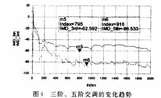 利用ADS2003进行系统级的仿真,在功率回退5 dB的情况下其仿真结果如图3~图8所示。图3表示自适应调整过程中α、β实部和虚部的变化情况,由图可以看出α的调整过程要先于β的调整。三阶、五阶交调总的变化趋势可以从图4看出,由图可知当调整继续进行下去三阶交调改善40 dBc,而五阶交调稳定后改善65 dBc。图5表示初始的误差频谱,图6表示调整后的误差频谱。图7表明功率回退5 dB的情况下产生较大的交调功率和谐波。图8表示经过自适应处理后前馈线性化器的输出。仿真结果表明经过自适应前馈处理,三阶交调和五阶交调均得到明显改善,功放的线性度明显提高。