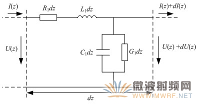 频率提高后,导线中所流过的高频电流会产生趋肤效应,工程上常用趋肤深度δ来描述这种趋肤效应,δ为电磁波场强的振幅值衰减到表面值1/e所经过的距离,由于趋肤效应使得导线有效面积减小,高频电阻加大,而且沿线各处都存在损耗,这就是分布电阻效应;通高频电流的导线周围存在高频磁场,这就是分布电感效应;由于两导线之间有电压,故两线之间存在高频电场,这就是分布电容效应;由于两线间的介质并非理想介质而存在漏电流,这相当于双线间并联一个电导,这就是分布电导效应。基于上述的物理事实,便可得出双线传输线等效模型如图1所示。