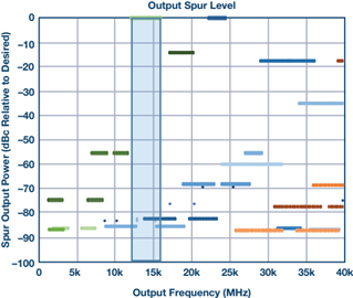 像对待接收通道一样,发射侧也可以生成混频器图表。示例如图10所示。在此图中,最大杂散是镜像和LO频率,利用混频器之后的带通滤波器可将其降到所需水平。在FDD系统中,杂散输出可能会使邻近接收机降敏,带内杂散会带来问题,这种情况下IF调谐的灵活性便很有用。在图10所示例子中,如果使用5.1 GHz的静态IF,发射机输出端会存在一个接近15.2 GHz的交越杂散。通过将14 GHz调谐频率时的IF调整到4.3 GHz,便可避开该交越杂散,如图11所示。
