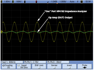还应在每个阶跃频率处检查运算放大器的输出,以确保它不会被阻抗分析仪产生的信号过驱。来自HP4192A的该信号的幅度可在0.1 V至1.1 V范围内调节,这刚好足以在运算放大器的输出中产生摆动,并使反相输入引脚中的电压电平略微发生变动。图5显示了频率为800 kHz时,运算放大器输出端的峰峰值无失真信号(绿色信号)为28 mV。2.76 V峰峰值幅度(1 V rms)的黄色信号是直接从分析仪的振荡输出端口探测得的。公平起见,可以任意决定不允许输出失真,不论是对DUT还是对HP4192A检波器。尽管该设置相对来说并不受探头效应的影响,但在获取阻抗和相位的实际数据时已经将探头移除。