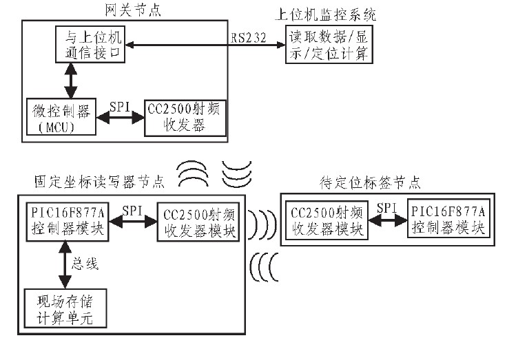 本系统主要由读写器和有源标签组成。读写器与标签之间的射频信号通过空间耦合实现无接触信息传递,读写器通过与标签的无线通信,获得接收信号强度指示(RSSI)值,这是对待定位标签进行位置计算的重要参数。微控制器PIC16F877A控制CC2500射频收发模块的数据发送与接收。读写器网关节点可通过RS232接口与上位机相连。系统结构框图如图1所示。