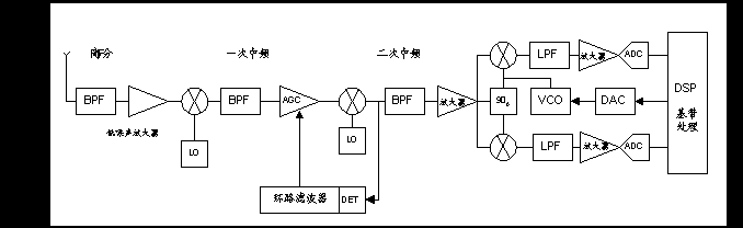 在这种接收机结构中,它的前端全部采用模拟信号。对模拟信号的数字化采样处理仅仅是在基带部分的DSP处理前才进行。每个接收信机中都有一套相同的从射频RF变换到基带信号的设备。如果要增加一路载波,就要添加一整套重复的设备。这种传统结构的优点在于技术比较成熟,模拟的低损耗的RF器件和IF器件比较容易实现。但是,其最大的缺点是在功能实现上对硬件的依赖性很强,缺乏可编程性,所以这种接收机一般用于窄带(单信道)处理。