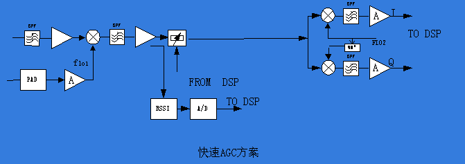 在GSM移动通信系统设计中,要求接收支路的动态范围很高。为了符合系统指标,有两种传统的解决方案:高低支路增益方案和快速AGC方案。为了减小电路的复杂程度,一般较多地在中频电路中采取AGC控制方案来实现接收机的动态范围控制(如图3)。但是,AGC的响应速度必须适应每个时隙的要求。