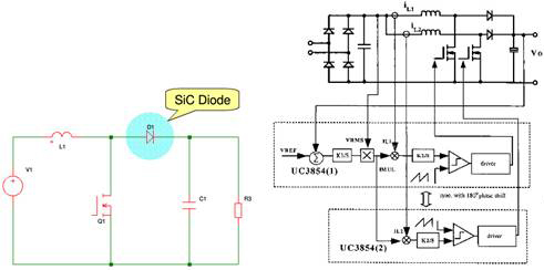 因为SiC器件的特性,SiC二极管的反向恢复时间接近0,因此开关损耗很低。将SiC用于PFC中可以带来的好处是:高频化、在较高的开关频率下依然可以得到较低的开关损耗,电感的体积可以减小,同时还提高了功率密度。