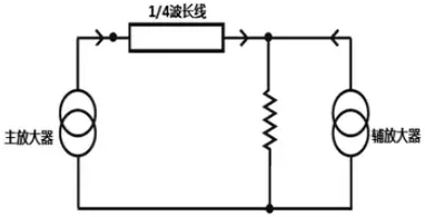 Doherty 电路拓扑如图1 所示[5],包含主放大器和辅放大器以及1/4 波长阻抗变换线,主放大器工作在AB 类,辅放大器工作在C 类。就本质而言,Doherty 技术就是主放大器通过1/4 波长阻抗变换线来实现有源负载调制,并以此来提高Doherty 功率放大器的效率[5]。