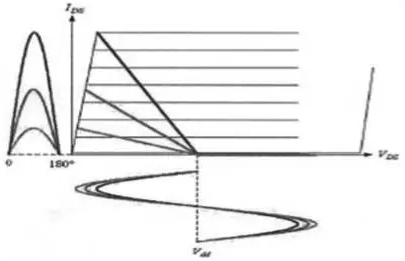 公式(1) 所示漏级效率仅仅与Vin 相关,当Vin 与Vmax 相等的时候,可以得到最大漏级效率。对于固定的负载线匹配,只有在峰值功率的时候,漏级效率才能达到最大值,但对于现代通信系统,尤其是大规模阵列天线系统,由于采用了OFDM 调制信号,功率放大器将工作在回退模式下以满足系统对线性的要求。有源负载线匹配技术使得在功率回退模式下Vin 与Vmax 的值相同,从而提高功率放大器的漏级效率[6],图2 所示为有源负载调制曲线图[6]: 根据不同的输入信号强度,并通过1/4 波长线实现主放大器的负载斜率的改变,以达到最大的Vin。