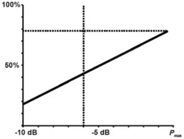 根据有源负载调制的原理以及公式(1),可以得出如图3 所示Doherty 功率放大器在一定回退功率范围内的漏级效率曲线图[5],而如图4 所示为传统的AB 类放大器的漏级效率曲线图[5],从而可以得出Doherty 功率放大器在一定的回退功率范围内,可以维持最大效率。