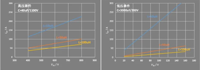 高压器件为了满足高压的测试需求,须选择耐压值高的母线电容,但此类电容容值较小,如用该电容来测试低压器件,能够实现的最大电流将大打折扣。对于功率器件来说,耐压和导通电阻是一对矛盾的关系,低压器件往往需要更大测试电流,所以低压器件应选择容值更大的母线电容。此外,由上图可知,在测试电压相同,负载电感越小可实现的最大电流值越大,为了满足低压器件大电流的要求,也应选择感量更小的负载电感。