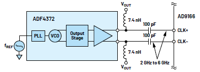 图2中的系统使用了ADF4372 PLL(见图5),这是一款集成VCO的宽带频率合成器,当与外部环路滤波器和外部参考频率一起使用时,可以作为小数N分频或整数N分频频率合成器。此外,VCO频率可进行1、2、4、8、16、32或64分频,因此用户可以在RF8x产生低至62.5 MHz的RF输出频率。