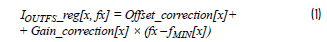 如公式1所示,电路板上必须为每个x区间存储三个参数,以便进行输出校正:即Offset_correction[x]、Gain_correction[x]和fmin[x]。