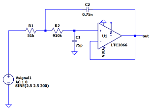 图4显示了电路的整体原理图,其中选择LTC2066来实现Sallen-Key、双极点、单位增益的低通滤波器。