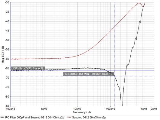 图 9. 基于仿真结果的低通 RC 滤波器,R=50 Ω,C=547 pF。