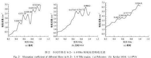图2为涤纶、芳纶1414、维纶在0.2~1.0 THz波段的吸收光谱,3个样品的吸收光谱有着明显差异。从样品的吸收光谱可以看出各样品在此频段内都存在多个明显的吸收峰。随着频率的增加,吸收光谱基线均出现了上升的趋势,这可能是由光散射或样品的宽而无结构的吸收所致。由图2可知,涤纶在0.468 75、0.571 29、0.688 48、0.820 31、0.922 85 THz处存在5个吸收蜂,芳纶在0.673 88、0.761 72、0.908 2 THz处存在3个吸收蜂,相比于前两者,维纶的吸收谱线较平稳,在0.4~0.8 THz处存在3个吸收峰,在0.966 8 THz处也有1个吸收峰。一般来说,对于不含重原子的固体而言,其远红外区域低频区的吸收主要是分子间的振动:1)分子间的弱相互作用如氢键振动、范德华力以及大分子的骨架振动、振动跃迁;2)晶格振动,即把晶体内部的分子或离子当成一个整体,他们在晶体内的相对运动(平动、转动及摆动)所引起的振动吸收。由于目前广泛使用的GAUSSIAN03软件包DFT理论只能对小分子的太赫兹光谱反映的振动模式给予解释,对高聚物而言目前还不能做到这点,因此,3个样品吸收光谱的差异只可从各自的结构作定性的分析,涤纶分子链以刚性链为主,分子较僵直,分子间无明显的分子间作用力,在结晶区,涤纶分子的晶胞为三斜晶系,晶格的振动可能引起其在太赫兹波段的吸收。芳纶为液晶高聚物,分子间的规整排列形成稳定的结晶结构,主要为原纤结构,原纤内为折叠链片晶。此外,其分子间还存在弱的氢键网络。弱氢键以及晶格的振动可引起其对太赫兹波的吸收,形成吸收峰。而维纶的晶胞内含有2个单元链节,属单斜晶系,其长链分子上的羟基在空间也可形成氢键。维纶内晶格振动和氢键作用可引起对太赫兹波的吸收,因此,他们的特征吸收光谱的差异主要是由不同的晶体结构以及分子间的弱相互作用(如氢键)所致。对纤维而言,折射率n一般在1.5~1.6之间。图3为样品的折射率与频率谱图,3种纤维的折射率均随着频率的增加呈递增趋势。涤纶的折射率范围在1.04~2.17之间,而芳纶和维纶分别为1.02~1.32和1.08~2.61之间。因此,他们的折射率也存在明显的差异。折射率的差异主要受纤维密度、入射光波长以及分子极性和极性基团的影响,因此,纤维的不同结构,晶格参数不同,分子排列方式不同,导致纤维密度不同,折射率也不同。此外,从芳纶的折射率频率曲线可以看出,纤维折射谱线的波动与吸收谱线相对性较好,即每个吸收峰都伴有折射率的变化,这说明在吸收峰附近芳纶呈反常色散现象,即在吸收峰附近芳纶的折射率随着频率的增加而减小。