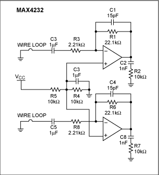 图1. MAX4232双运放的RF噪声抑制能力测试电路